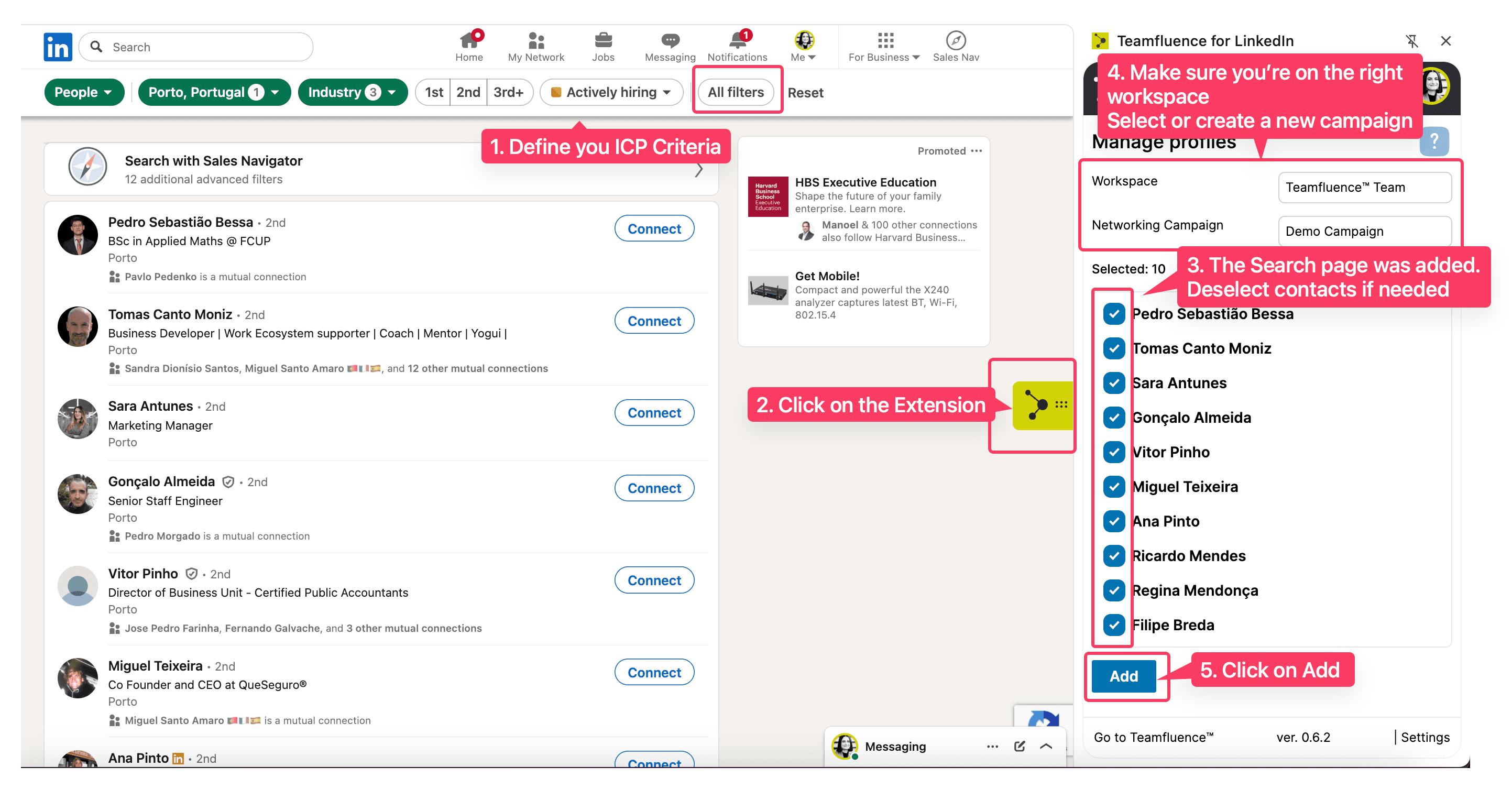The extension will display the first 10 (LinkedIn) or 25 (SalesNavigator) contacts from your current page. You can deselect any contacts you don’t want to include. Click Add to send these contacts to your campaign.