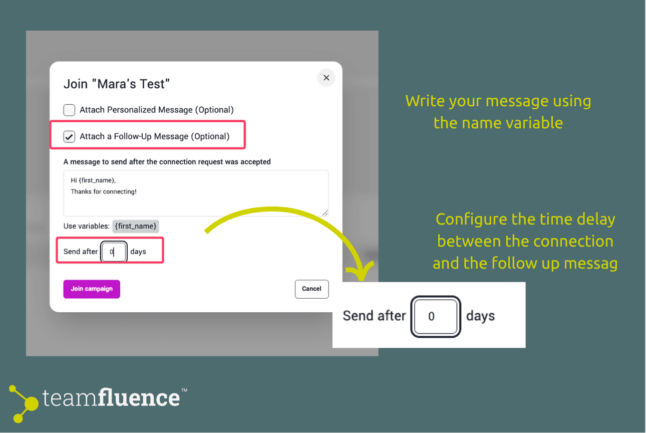 Optionally, you can also configure a follow-up message to be sent if the connection request is accepted.