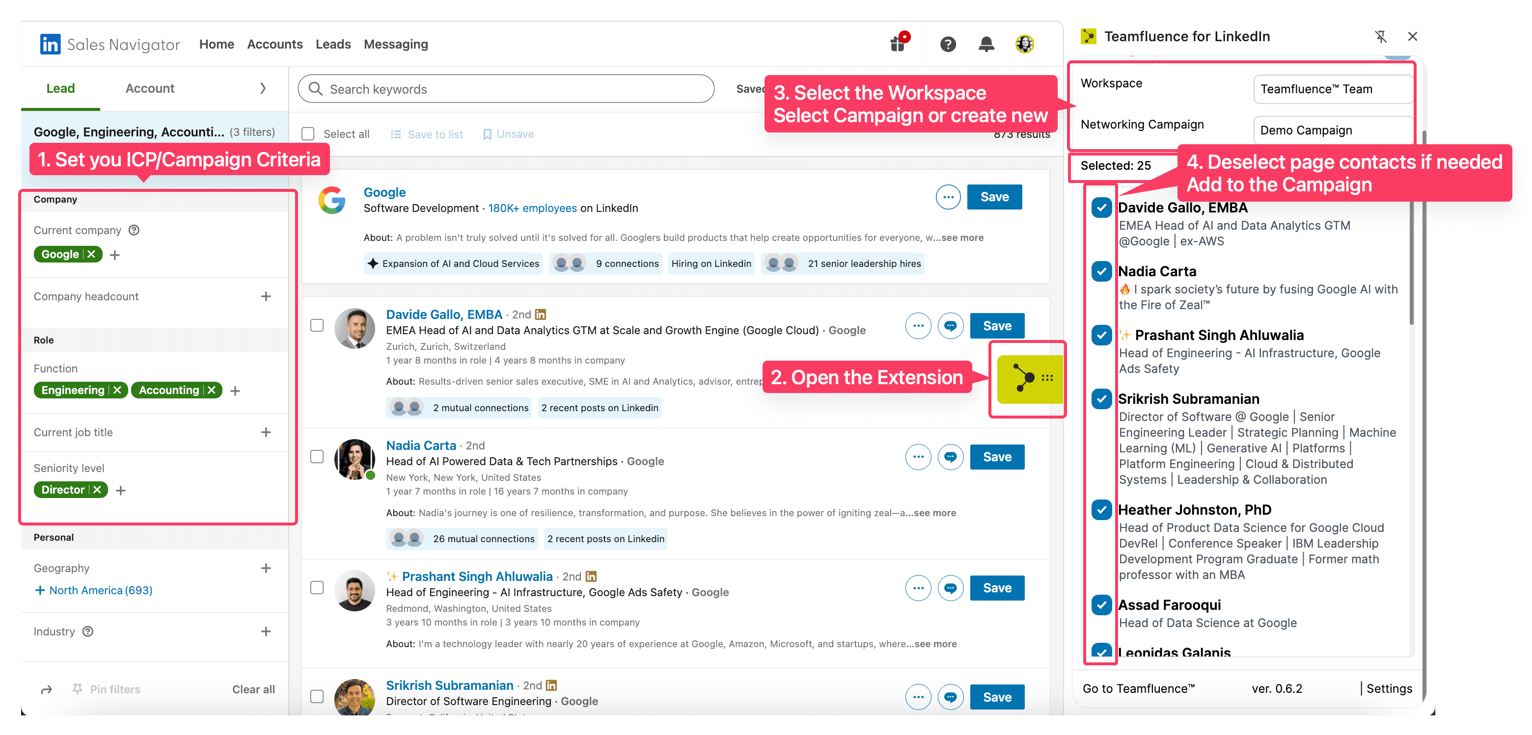 Use LinkedIn or Sales Navigator search filters to target the people or industries most relevant to your campaign. You’ll now see the TeamFluence plugin directly on the sidebar of your browser when using LinkedIn or Sales Navigator. Click the extension icon to open and it will automatically collect data from the current page.